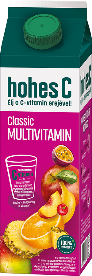 A hohes C Multivitamin gyümölcslé 100% gyümölcstartalmú ital. Tíz különböző vitamint tartalmaz, egy igazi vitaminbomba. Már 3 dl fedezi belőle a szükséges napi C-vitamin bevitelt*, valamint a többi hozzáadott 9 vitaminból az ajánlott napi mennyiség háromnegyedét. A C-vitamin hozzájárul a fáradtság és a kifáradás csökkentéséhez. *napi ajánlott mennyisége felnőttek számára 80 mg.