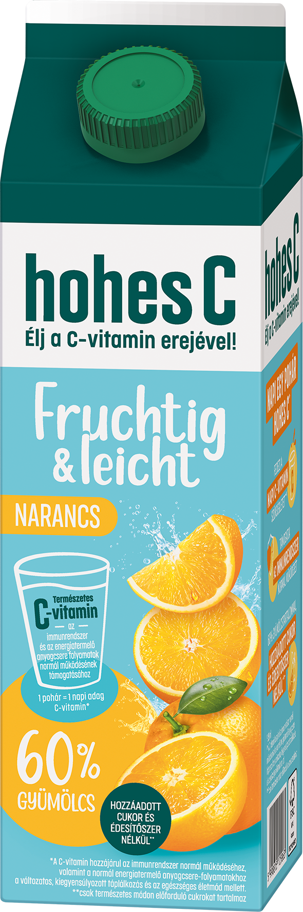 hohes C Fruchtig & leicht narancsital 60% gyümölcstartalommal, hozzáadott cukor és édesítőszer nélkül! Élvezd a könnyed és gyümölcsös 100% természetes gyümölcsitalt a hohes C márkától megszokott magas minőségben. Élj a C-vitamin erejével, hiszen már egy pohár (0,25 liter) hohes C Fruchtig & leicht narancsital fedezi a felnőttek számára ajánlott napi C-vitamin mennyiséget. A C-vitamin hozzájárul az immunrendszer normál működéséhez és a normál energiatermelő anyagcseréhez. Kiegyensúlyozott étrend és egészséges életmód ajánlott.
