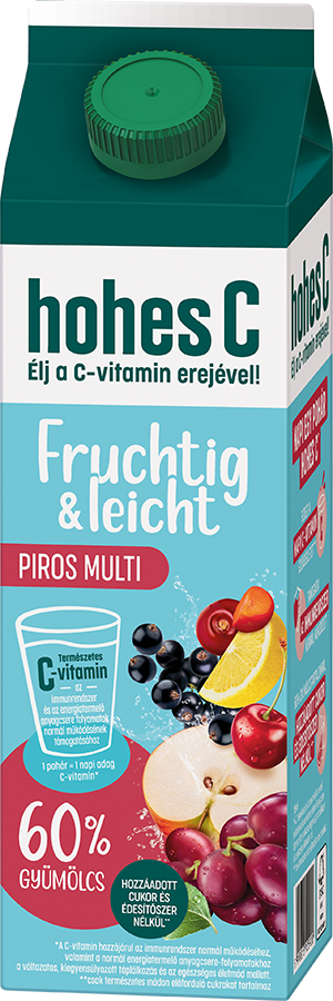 hohes C Fruchtig &leicht Piros Multi vegyes gyümölcsital 60% gyümölcstartalommal, hozzáadott cukor és édesítőszer nélkül! Élvezd a könnyed és gyümölcsös 100% természetes gyümölcsitalt a hohes C márkától megszokott magas minőségben. Élj a C-vitamin erejével, hiszen már egy pohár (0,25 liter) hohes C Fruchtig & leicht Piros Multi vegyes gyümölcsital fedezi a felnőttek számára ajánlott napi C-vitamin mennyiséget. A C-vitamin hozzájárul az immunrendszer normál működéséhez és a normál energiatermelő anyagcseréhez. Kiegyensúlyozott étrend és egészséges életmód ajánlott.