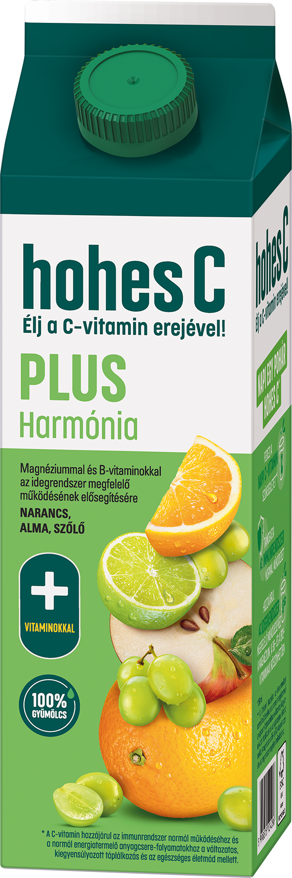 Már egy pohár (0,25 liter) hohes C Plus Harmónia segít gondoskodni a szervezet mindennapi vitaminbeviteléről: fedezi a felnőttek számára ajánlott napi C-vitamin mennyiséget, valamint hozzájárul a magnéziumszükséglet jelentős részének fedezéséhez. A C-vitamin támogatja az immunrendszer normál működését és a normál energiatermelő anyagcsere-folyamatokat, míg a magnézium, a B6- és a B12-vitamin az idegrendszer megfelelő működéséhez járul hozzá a kiegyensúlyozott étrend és egészséges életmód részeként. A hohes C Plus Harmónia 100% gyümölcstartalmú, narancs-, alma- és szőlőalapú vegyes gyümölcslé, amely frissítő ízével és gondosan összeválogatott vitamintartalmával ideális választás a mindennapokra.