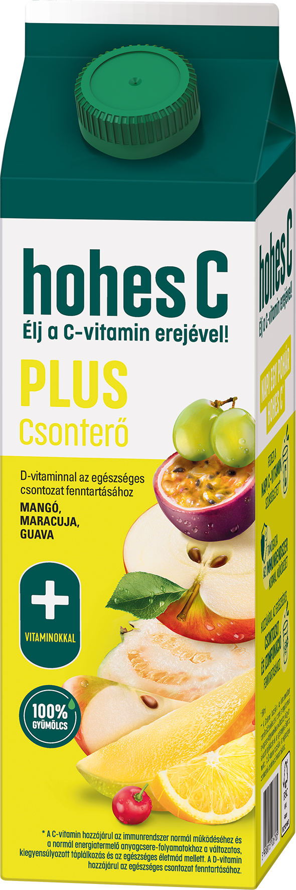 Már egy pohár (0,25 liter) hohes C Plus Csonterő támogatja a mindennapi vitaminbevitelt: fedezi a felnőttek számára ajánlott napi C-vitamin mennyiséget, valamint hozzájárul a D-vitamin-szükséglet jelentős részének fedezéséhez. A C-vitamin segíti az immunrendszer normál működését és a normál energiatermelő anyagcsere-folyamatokat, míg a D-vitamin hozzájárul az egészséges csontozat és izomfunkció fenntartásához a kiegyensúlyozott étrend és az egészséges életmód részeként. A hohes C Plus Csonterő 100% gyümölcstartalmú, mangóval, maracujával és guavával készült vegyes gyümölcslé, amely izgalmas ízével és gondosan összeállított vitamintartalmával ideális választás a mindennapokra.