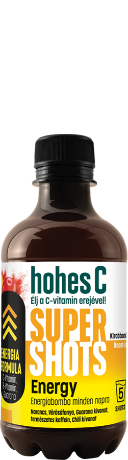 hohes C Super Shots Energy – kirobbanó ízű vitaminbomba minden napra. Kezdd a napot energikusan a narancs, az áfonya, a természetes koffein, a chili- és guaranakivonat kombinációjával! A Super Shots Energy segít fedezni a napi C-vitamin-szükségleted, a benne lévő B12-vitamin és pantoténsav pedig gondoskodnak arról, hogy egész nap lendületben maradj. A C-vitamin hozzájárul az immunrendszer normál működéséhez, a B12-vitamin és pantoténsav részt vesznek az energiatermelő anyagcsere-folyamatok fenntartásában. A hohes C Super Shots Energy ideális kiegészítője a kiegyensúlyozott étkezésnek és az egészséges életmódnak. Tartósítószer-mentes A Super Shots-ok nem tartalmaznak tartósítószereket és hozzáadott cukrot. Nincs bennük semmilyen állati eredetű összetevő, vegán italok.