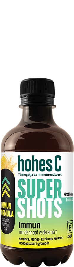 hohes C Super Shots Immun – kirobbanó ízű vitaminbomba minden napra. Tökéletes választás, ha gyorsan és egyszerűen tennél az egészségedért. Az egyedi narancs-mangó páros szinte táncra perdül a szádban, miközben a gyömbér- és a kurkumakivonat gondoskodik az egészséges extráról. Egy shot (66 ml) a napi vitamin- és ásványianyag-szükséglet jelentős részét fedezi: a C-vitamin 100%-át, a D-vitamin 75%-át, és a cink 38%-át. Mind a három hozzájárul az immunrendszer normál működéséhez – ideális kiegészítői a kiegyensúlyozott étkezésnek és az egészséges életmódnak. Az öt 66 ml-es adagot tartalmazó, helytakarékos kiszerelésnek köszönhetően egy üveggel egy egész munkahétre felvértezheted magad. Hohes C Super Shots. A napi vitamin és ásványianyag adagod gyorsan, egyszerűen és finoman. Vagyis kirobbanó ízű vitaminbomba minden napra. Finom gyümölcsök válogatott kombinációjával, gyömbérrel és társaival a tökéletes összhangért. A hohes C Super Shots Immun különleges ízélményt kínál. A gyömbér és a kurkuma összetéveszthetetlen, finom csípősségük segítségével minden alkalommal meglepnek, miközben hozzák azt a bizonyos egészséges extrát is. Az egyedi narancs-mangó páros pedig szinte táncra perdül a szádban. Így áll össze a tökéletes gyömbéres, gyümölcsös shot: nem túl erős, nem túl enyhe, éppen jó. Shotjaink azonban nem csak az ízlelőbimbóidnak élvezetesek, hanem fontos vitaminokkal és ásványi anyagokkal is ellátnak. A Hohes C Super Shots Immun C és D-vitamint, valamint cinket tartalmaz, amelyek hozzájárulnak az immunrendszer normál működéséhez. Egy shot (66 ml) a napi vitamin és ásványi anyag szükséglet jelentős részét fedezi: a C-vitamin 100%-át, a D-vitamin 75%-át és a cink 38%-át. Ideális kiegészítői a kiegyensúlyozott étkezésnek és az egészséges életmódnak.Tartósítószer-mentes A Super Shots-ok nem tartalmaznak tartósítószereket és hozzáadott cukrot. Nincs bennük semmilyen állati eredetű összetevő, vegán italok.